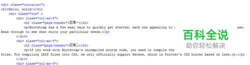 它就是通过一系列的行(row)与列(column)的组合创建页面布局,然后你的内容就可以放入到你创建好的布局当中。 下面就简单介绍一下Bootstrap栅格系统的工作原理: 行(row)必须包含在.container中,以便为其赋予合适的排列(aligment)和内补(padding)。 使用行(row)在水平方向创建一组列(column)。 你的内容应当放置于列(column)内,而且,只有列(column)可以作为行(row)的直接子元素。 类似Predefined grid classes like .row and .col-xs-4 这些预定义的栅格class可以用来快速创建栅格布局。Bootstrap源码中定义的mixin也可以用来创建语义化的布局。 通过设置padding从而创建列(column)之间的间隔(gutter)。然后通过为第一和最后一样设置负值的margin从而抵消掉padding的影响。 栅格系统中的列是通过指定1到12的值来表示其跨越的范围。例如,三个等宽的列可以使用三个.col-xs-4来创建。 新建html文件:如图内容所示
