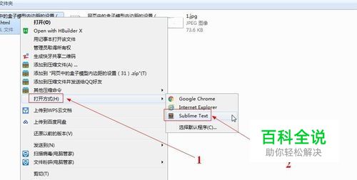 2.如图所示,我们在这个html图标上鼠标右击,在弹出的下拉列表菜单中,我们 依次选择“打开方式(H)”,之后选择“Sublime Text”这个文本编辑器来编 写这个html文档。