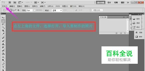 进入PS后,点左上角的文件,找到打开导入要制作的照片。