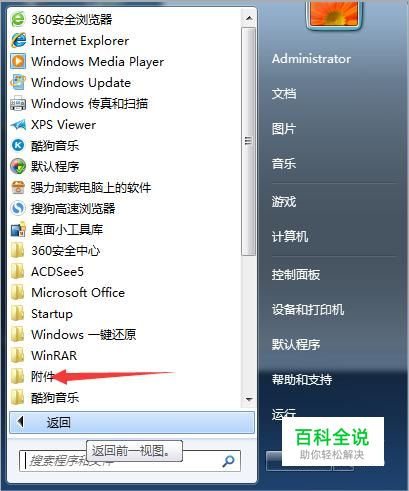 点击”开始“按钮,找到”所有程序“中”附件“按钮,如图。