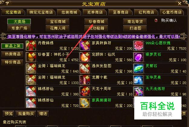 此方法玩家可以通过元宝商店购买获得珍兽技能书,首先点击进入元宝商店,然后点击元宝商店→珍兽商城。