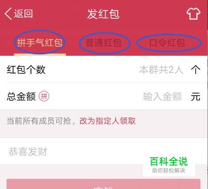 可以看到可以发送的几种红包形式,其中,拼手气红包还有口令红包发送后领取红包的人收到的红包金额都是不定额的,而普通红包的领取是定额的,也就是人均分。