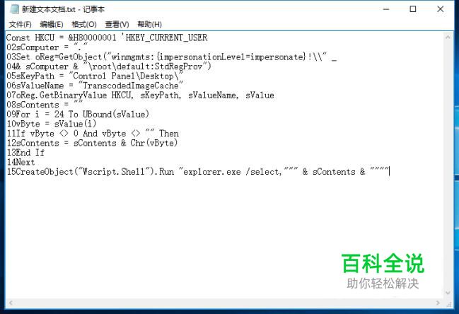 将如下代码复制到记事本中,命名为“添加壁纸所在位置.reg”。 Windows Registry Editor Version 5.00 02[HKEY_CLASSES_ROOT\DesktopBackground\Shell\DesktopWallpaperLocation] 03"icon"="imageres.dll,-5346" 04@="进入壁纸所在位置" 05[HKEY_CLASSES_ROOT\DesktopBackground\Shell\DesktopWallpaperLocation\command] 06@=hex(2):77,00,73,00,63,00,72,00,69,00,70,00,74,00,20,00,22,00,25,00,77,00,69,\ 0700,6e,00,64,00,69,00,72,00,25,00,5c,00,53,00,79,00,73,00,74,00,65,00,6d,00,\ 0833,00,32,00,5c,00,57,00,61,00,6c,00,6c,00,70,00,61,00,70,00,65,00,72,00,50,\ 0900,61,00,74,00,68,00,2e,00,76,00,62,00,73,00,22,00,00,00 PS:同样需要更改记事本扩展名哈!