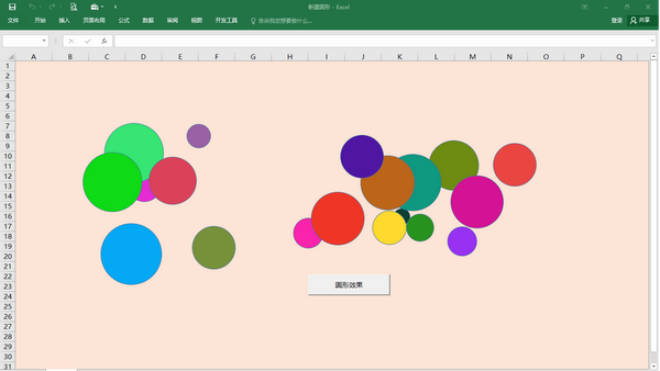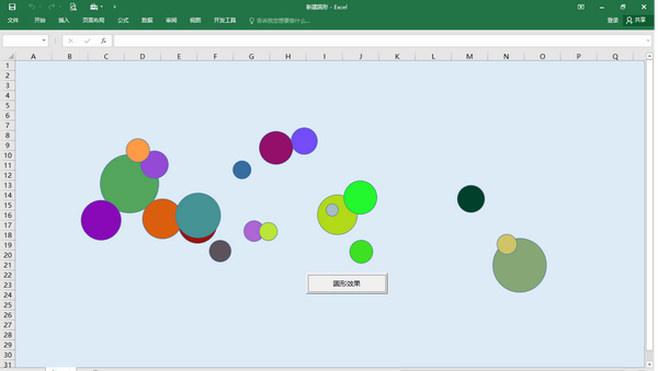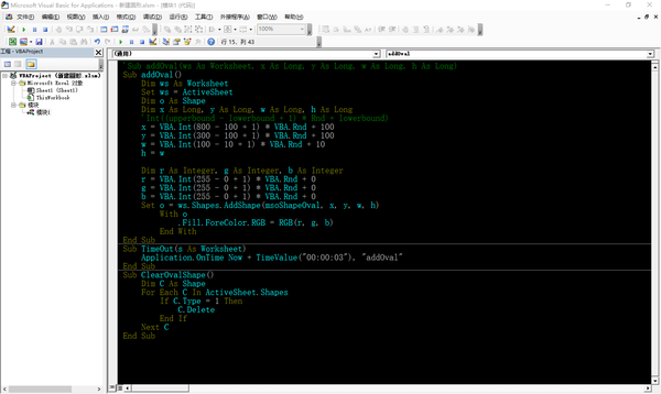Sub addOval() Dim ws As Worksheet Set ws = ActiveSheet Dim o As Shape Dim x As Long, y As Long, w As Long, h As Long x = VBA.Int(800 - 100 1) * VBA.Rnd 100 y = VBA.Int(300 - 100 1) * VBA.Rnd 100 w = VBA.Int(100 - 10 1) * VBA.Rnd 10 h = w Dim r As Integer, g As Integer, b As Integer r = VBA.Int(255 - 0 1) * VBA.Rnd 0 g = VBA.Int(255 - 0 1) * VBA.Rnd 0 b = VBA.Int(255 - 0 1) * VBA.Rnd 0 Set o = ws.Shapes.AddShape(msoShapeOval, x, y, w, h) '新建一个圆形 With o .Fill.ForeColor.RGB = RGB(r, g, b)'填充圆形颜色 End With End Sub