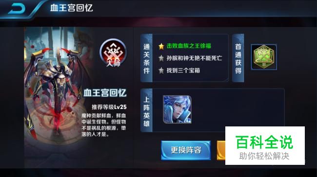 然后点击“更换阵容”以选择上阵的英雄,这里也就是最关键的一步了,要想通过血王宫回忆,必须要选择正确的英雄才能够通关,所以,技能里面有回血,有减伤的英雄是首选。