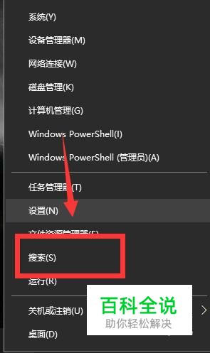 右击开始菜单,点击列表中的搜索选项。