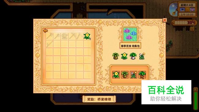 最后一个是工匠收集包。里面的奶酪、蜂蜜、果酱还有山羊奶酪是比较好收集的,剩下的就是水果,可以看着时间买几个果树种子,比如夏天把苹果树种下去,秋天就能收获果实了。当然这对金钱的要求有些高,所以要努力耕种、钓鱼挣钱才能买果树种子。其他的东西也可以去猪车碰运气,反正看见了就买。