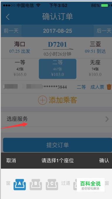 接着出现确认定单页面,在中间位置有个选坐服务四个字,我们点击选座服务后,界面下方会弹出座位图表,这时候我们就可以按需要选好座位。再次检查出发地目的地和时间及购票人,确定无误后选择好座位后点击确定。