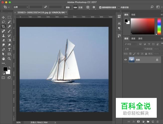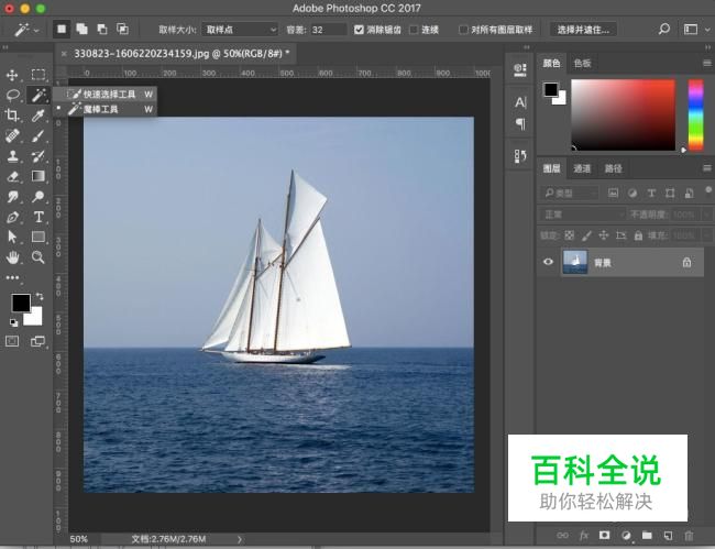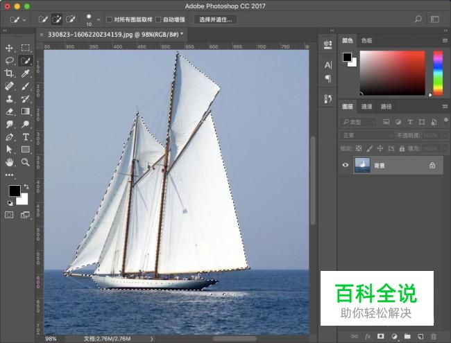 使用魔棒工具在图片中框选主体,以下图为例,框选船只部分。