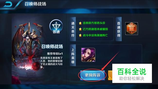 点击”更换阵容“,选择好上阵英雄(最多可以选择3个)之后,点击右下角的确定,开始闯关。注意更换阵容之前上面有通关提示,想要获得3星评分需要做完上任务。