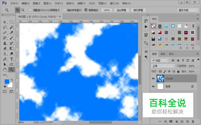 这样,我们就制作好了蓝天白云图片,双击放大镜工具,放大到100%显示看一下效果如图。