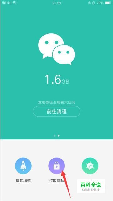 进入“手机管家”后,点击“权限隐私”,也就是中间的选项。