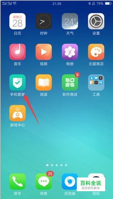 打开手机在主界面上找到“手机管家”并且进入管家(设置应用密码也是在“手机管家”中完成的,因此取消也是在这里完成)。