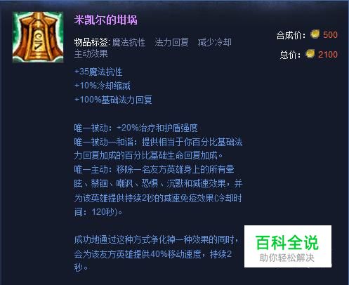 第五件大装可以选择做出“米凯尔的坩埚”,ADC救命稻草,该装备主动技能,能够帮助己方队友解除控制状态;(装备属性:+35魔法抗性、+10%冷却缩减、+100%基础法力回复,详细被动见图 )