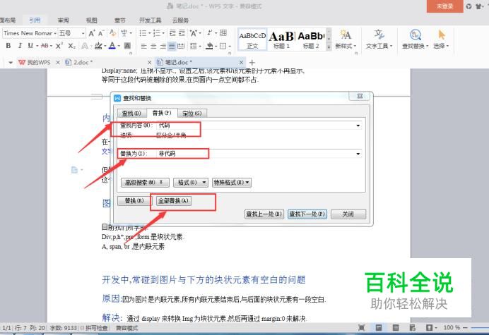 输入【查找内容】和【替换成】的内容,然后点击【全部替换】,文档中出现的【查找内容】都会被替换成【替换内容】,如下图所示: