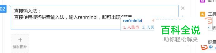 直接输入法: 直接使用搜狗拼音输入法,输入renminbi,即可出现¥符号。