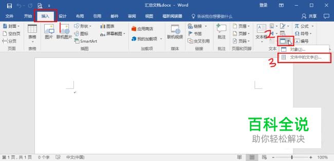 在插入工具栏中选择插入对象,点击插入对象旁边的下拉箭头,在下拉菜单选择“文件中的文字"