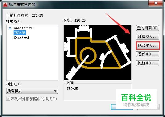 点击注释样式选项,在弹出的对话框内找到修改选项,如图所示: