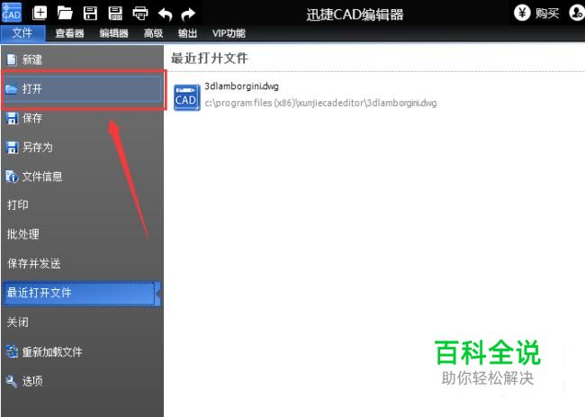 运行CAD编辑器,打开软件之后,点击界面的“文件”选项,然后点击“打开”选项,将CAD文件打开。