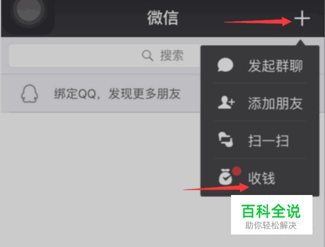 在微信界面上有一个+的地方,点击会出现收钱二字。点击进入收钱。
