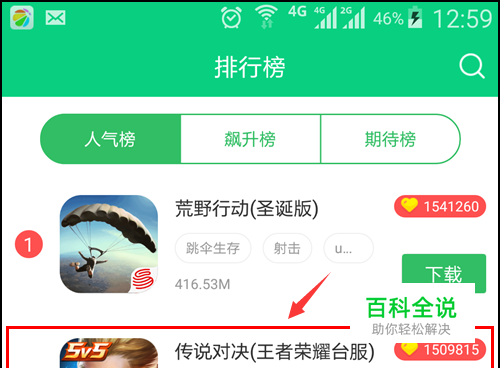 打开后,在排行榜中人气榜中找到传说对决,(也可以用搜素框进行搜素),如图所示