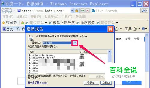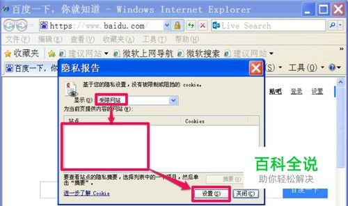 进入隐私报告窗口,在“显示”后面的值是“所有网站”,打开下拉框,选择“受限网站”看一看,如果有,就取消,但也没有发现受限的网站,只能再点击“设置”按钮。