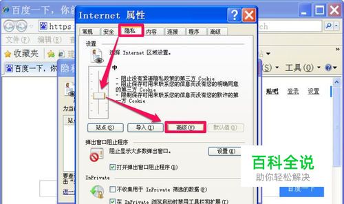 进入Internet 选项的“隐私”选项卡,在网站级别上设置为“中”,然后点击“高级”按钮。