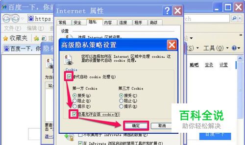 在高级隐私策略设置窗口,先勾选“替代自动Cookie处理”这一项,然后在下面勾选“总是允许会话Cookie”,再按确定。 按说到此,问题就应该解决了,可以重启浏览器,再登录试试。