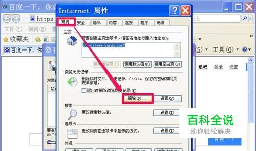 但我那位朋友重启浏览器后,却还是登录不上,看来还是有问题,再清理一下网页缓存试试,因为很多时候,问题就出在网页缓存上。 在Internet选项的“常规”选项卡中,点击“删除”按钮。