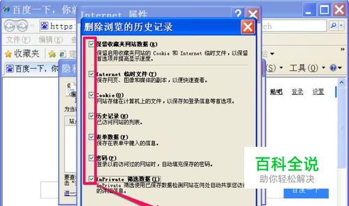 在删除浏览的历史记录窗口,勾选所有的选项,然后按“删除”按钮,再重启浏览器试试,结果,这一回登录上了。