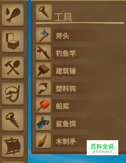 “工具”科技栏包含八项基础工具。 其中“建筑锤”“塑料钩”和“木质矛”要第一时间制作。