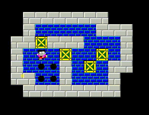 其实,这个“小人”只需要找到一条通道跑到上面就行了。 下面就构造“出路”,把顶上的箱子消灭掉。