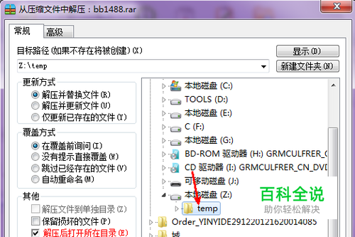 将这个字库的文件夹解压到某一个文件夹中,比如我解压到Z盘中,选择好Z盘,然后点击确定开始解压。