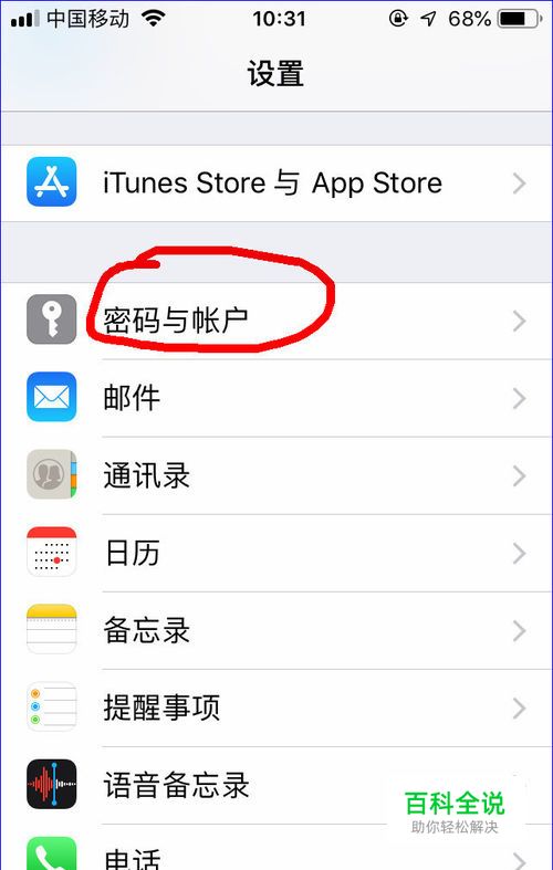 打开我们的iPhone手机,然后进入到手机设置,在设置里向下滑动,找到“ 密码与帐户”功能菜单项。