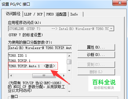2、依次设置程序访问点—当前电脑使用的网卡类型。选择后可以使用诊断—测试检测连接情况。步骤同方法一,如图所示。(注意选择当前电脑网卡时同样要选择后缀为Auto。1<激活>的选项)