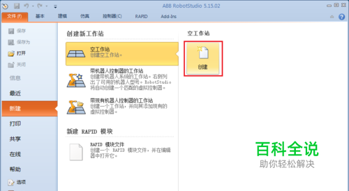 打开“ABB RobotStudio”后如下界面。我们直接点红圈中的“创建”