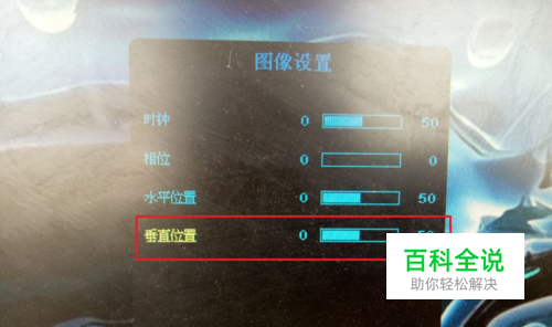 第五步,调整垂直位置:在图像设置界面按+或-键选择垂直位置——再按+或-键调整到50的比例——按menu键确定。