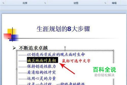 我们要先确认文档里的文字,是文字的形式还是图片的格式。 打开文档,用鼠标点击PPT里的文字,如果文字能被选中,就代表这个PPT,是文字格式。