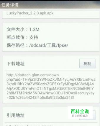 2、下载必须使用uc浏览器。废话不多说,用uc浏览器进入你要下载的百度云页面,并进行下载,掌握好时间,记住是在几点开始下载的。然后,在五十几分钟过后暂停下载,再次进入你要下载文件所在的百度云页面,再次点击下载。这时候由于下载地址已经变化,所以uc会另外新建下载,新建的这个下载连接我们把它暂停。然后长按这个新建的下载任务几秒钟就会出现选项框,我们选择“任务详情”,就会出现如下图