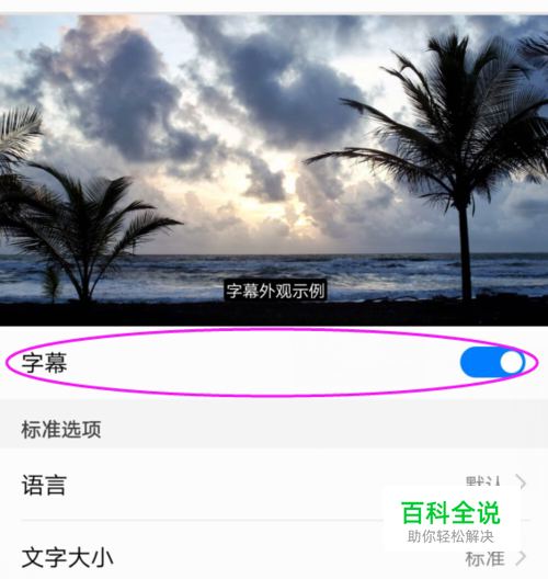 我们就可以在这里开启手机字幕,在字幕下方,我们还可以设置语言、文字大小、风格等,如图。