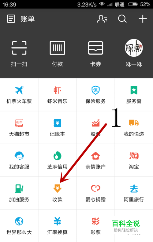 第一步:当然是打开支付宝了,下划页面找到“收款”的选项。看图中数字1所指。