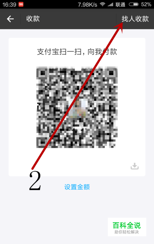 第二步:点击这个“收款”选项,点进去之后找到右上角的“找人收款”选项。如图中箭头2所指。