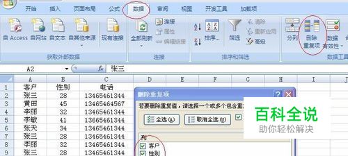 利用“删除重复项”删除重复数据 单击“数据”——“删除重复项”,会弹出“删除重复项”对话框;对话框勾选通过哪列来确定重复,比如该表通过“客户”和“电话”确定是同一个,就勾选这两个,点击“确定”,就会去除重复数据。