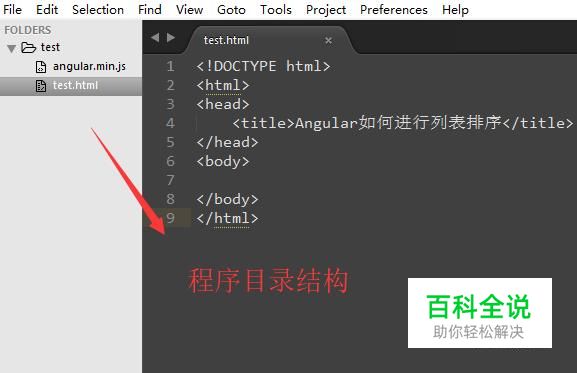 打开Sublime Text软件,新建一个目录结构,在目录里面添加angular的js库文件和html文件,如下图所示