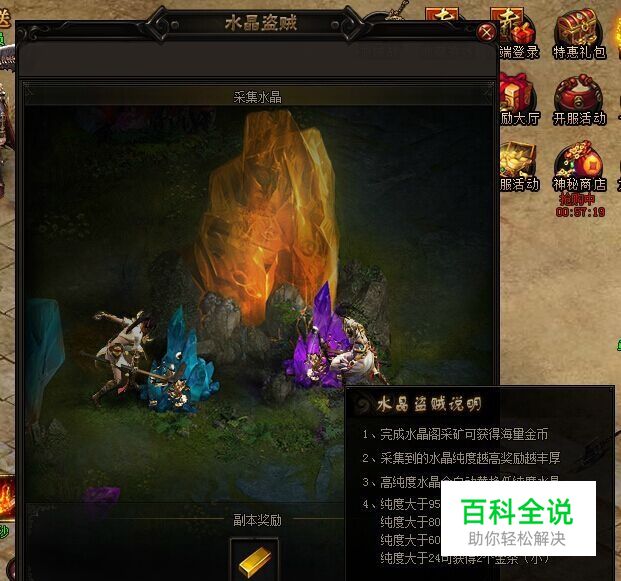 在赤月传说2网页游戏中,金币是必不可少的一种货币,装备强化、灵宠升级都需要用到它。玩家要想获得金币,那就得作为盗贼前去采集水晶,然后根据采集到的水晶给予奖励。那赤月传说2水晶盗贼怎么玩呢怎么才能获得更多的金币呢下面小编将对这一玩法进行说明。 赤月传说2水晶盗贼任务每天可接取3次,NPC是赤月土城的财神。 点击NPC财神弹出对话窗,再点击“进入挑战”,系统便会将角色传送进入水晶阁。水晶阁内分布着5种颜色的水晶,分别是蓝水晶、紫水晶、红水晶、黄水晶、绿水晶。而你需根据提示前取采集指定颜色的水晶。 其实也不需要你手动前往,一进入水晶阁,角色便会自动前往目的颜色的水晶处开始采集。每次任务只需要采集5个水晶即可领取奖励,当然了,若你不停止采集动作或还未领取奖励,那么角色将一直采集下去。 赤月传说2水晶盗贼玩法奖励是金条(小),使用1根可获得50万绑定金币。但获得的金条数量是由你采集到的水晶的总纯度决定的,水晶总纯度越高,那么收获的金条数量就越多。具体奖励如下: 纯度大于24可获得2根金条(小); 纯度大于60可获得3根金条(小); 纯度大于80可获得4根金条(小); 纯度大于95可获得6根金条(小)。 角色在采集过程中,采集到的高纯度水晶会自动替换低纯度水晶,全程无需玩家动手。 水晶盗贼任务是获取金币的一个途径,玩家还可通过赤月传说2在线奖励、商城购买、押镖、BOSS掉落、回收装备等方法获取金币。