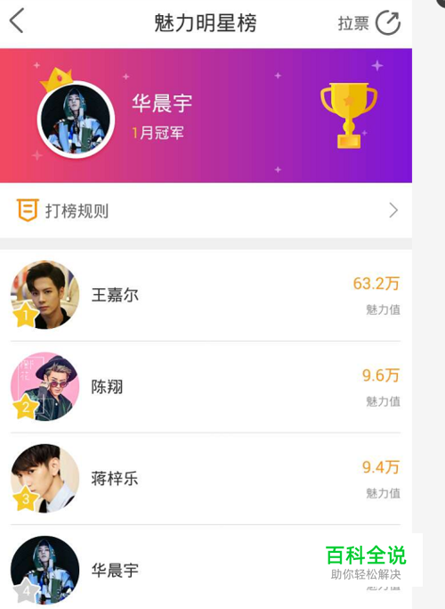 给自家爱豆打榜 点开打榜规则,就可以看到打榜的一些技巧;在自家爱豆的明星主页多活跃,多送礼,明星的人气就会蹭蹭往上涨喔。点击右上角“拉票”按钮,还可以分享给朋友给明星拉票喔。
