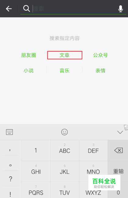 点击右上角放大镜搜索图标,然后选择文章。