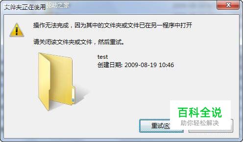 下面我们模拟再现文件无法删除的状况。在D盘创建一个名为test的文件夹,然后运行命令提示符(cmd)并将命令路径定位到该文件夹目录下。此时,我们删除test文件夹,可以看到弹出如图1所示的对话框,提示:操作无法完成,文件夹或文件在另一程序中打开。