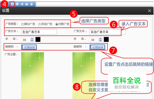 2、点击设置,选择需要的广告类型,录入广告文本并设置广告的链接和主题。