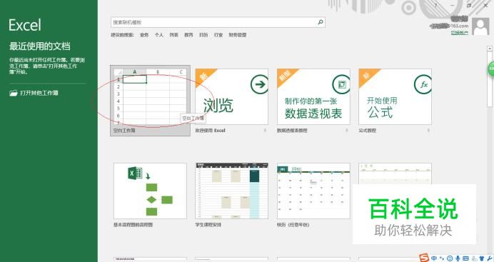启动Excel 2016电子表格应用程序,如图所示点击屏幕右侧新建空白工作簿。